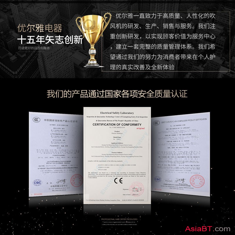 揭阳市榕城区优尔雅电吹风器厂是吹风机、电吹风、卷发器、直发器、风罩等产品专业生产加工的公司,拥有完整、科学的质量管理体系。揭阳市榕城区优尔雅电吹风器厂的诚信、实力和产品质量获得业界的认可。欢迎各界朋友莅临参观、指导和业务洽谈。
