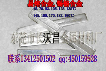 东莞沃昌金属材料厂产的这种材料是一种特制的多元共晶金属,熔点极低,凝固后可马上投入生产使用,且热膨胀系数相当低.用相同温度的热水或热油浸泡注有低熔点合金的工件,很容易将低温合金从模具上,固定夹具或零件中回收并可循环使用.(熔点有48℃、58℃、70℃、80℃、92℃、125℃、130℃、138℃、145℃、170℃、183℃等等)可根据客户要求定制各种温度的低熔点合金.用途:1.眼镜片、光学镜头与夹具的粘结。2.液力偶合器用易熔合金,放射治疗,防辐射专用挡块;3.生产特殊产品用模具、铸造特殊用产品;4.用于电子电气自动控制,作热敏元件、保险材料、火灾报警装置等;5.薄壁弯管和精密零件加工的内外填充物,此合金线变形系数极低,而且容易清除,所以决定了他们的特殊用途。6.焊接材料:特别适用于不耐高温物质间的焊接和精密模具接口的焊接。咨询订购电话: 13412501502 / 13729988897 / QQ450159528 网址:http://www.dgwochang.com诚信通:http://www.5396227.cn供应弯管填充70℃易熔合金