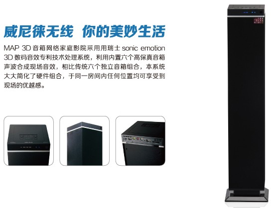 Sonic Emotion开发了灵活的信号处理器,该处理器可以在一个房间里动态的移动声场。由于不断的技术研发,sonic emotion在2009年初发布了sonic waveⅠ3D声音处理器。 sonic waveⅠ处理器不仅比传统的声场合成系统需要更少的扬声器,而且可以完全由用户自行配置、安装。Sonic emotion力争通过简化声场合成,使得新的声音再生方式能够服务于更广泛的大众。此技术本公司VELOUR“威尼徕”智能音响已获得独家做用权。VELOUR“威尼徕”NE-850MD6.1立体声无线WI-FI家庭影院,就采用了此项技术,一体机就能达到7个组合音箱的效果,自动调整音响放置地点与周围环境的最佳3D音效,随时随地给您享受听觉盛宴。