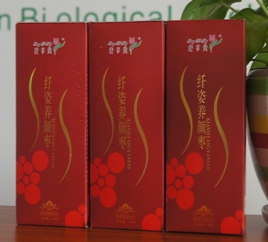 产品介绍产品类型:果脯类配料表:阿胶蜜枣(枣、阿胶、白砂糖、麦牙糖、食品添加剂:山梨酸钾)决明子、荷叶、低聚果糖、维生素C食用方法:每日一次:餐后或饭前拆开1-2包嚼食,并摄入50-100毫升温开水。净含量:130克储存方法:避免置于高温、潮湿及日光直射处,冷藏后口感更佳。注意事项目:孕妇、幼儿、严重消化道溃疡者慎用生产日期:保质期:两年产品属性纤姿养颜枣:精选山东阿胶蜜枣为载体,采用先进的超低温冷冻萃取技术从荷叶、普洱茶等可作膳食之用的绿色植物中萃取其有效成分,配合阿胶、低聚木糖、天然维生素C经科学配伍秘制而成的新一代健康、绿色食品。其他说明一日吃三枣,一生不显老;想要皮肤好,粥里放大枣。 据宋代孙光宪《北梦琐言》里面记载,有一位年过半百的女人,依然亭亭玉立,面容靓丽如妙龄少女,于是就有人问她有什么防老之术,她说无它术,一日三颗枣而已。也就由此在民间流传一个谚语:“一日吃三枣,一生不显老。” 润:低聚木糖、荷叶等有效成份能润肠调理,软化、润滑粪便,使大便易于排出体;清除体内毒素、恢复肠道机能,轻松解决便秘问题。 清:枣中含有丰富的糖类和维生素C以及环-磷酸腺苷等,能减轻各化学药物对肝脏的损害,并有促进蛋白合成,清除血液中毒素,增加血清总蛋白含量。 低聚木糖对病原菌有较强的吸附力,如大肠杆菌、肠炎门氏菌、肺炎克雷伯氏菌、嗜水气单胞菌等都能吸附到低聚木糖上,由于低聚木糖不被肠道中的消化酶所降解,可携带附着的病原菌通过肠道排出体外,清除肠道内有害菌调节人体菌群平衡。维生素C可直接参与重金属的解毒过程,可有效预防像铅、镉、汞等有害重金属对人体的毒害作用,清除人体重金属。交易说明可选择支付宝或款到发货