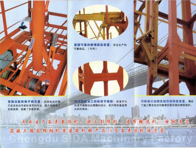 成都四达机械制造有限公司,西南地区规模最大的工程,各行业装备用卷扬机(绞车),基建工程冲击钻机,建筑施工升降机,建筑施工电梯,混凝土路面摊铺机械的研发制造企业.中国工程机械起重协会会员单位,ISO9001-2000国际质量体系认证企业,全国工业产品生产许可认证企业,全国特种设备制造许可认证企业。产能技术装备:其齿轮加工能力最大直径可达2000mm高精度工摸夹具保证其零部件的精度与品质.多组生产线专机及在线工装保证每一台产品整机可靠性.5000平米现代化标准厂房,多组精良机械制造装备.