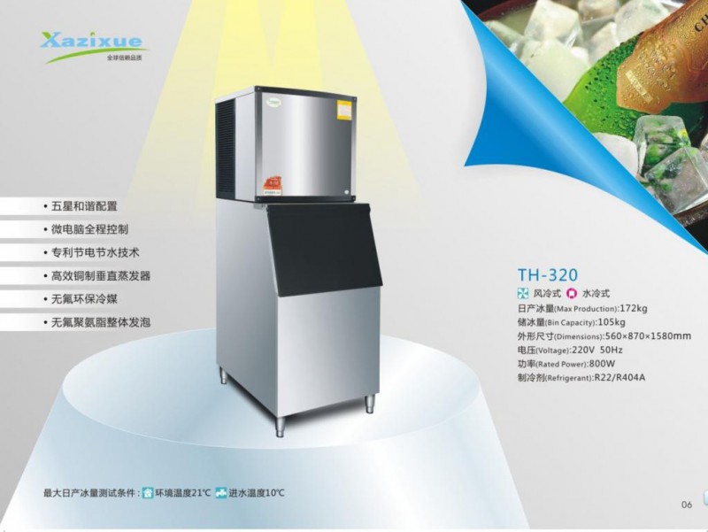制冰机是一种将水通过蒸发器由制冷系统制冷剂冷却后生成冰的制冷机械设备。根据蒸发器和生成过程方式原理不同,生成的冰的形状也不同,人们一般根据冰形状将制冰机分为颗粒冰机、片冰机、板冰机、管冰机、壳冰机等等工作原理 ⒈储水箱的冷冻水用水泵不断循环流经板式或分格的蒸发器;⒉压缩机运转后经吸气-压缩-排气-冷凝(液化)-节流-再在蒸发器中以-10至-18度的低温蒸发吸热汽化。冷冻水在0度的水温中不断在更低温的蒸发器表面凝结成冰层。当冰层凝结到一定的厚度的时候,致冷剂的蒸发温度达到温控的设定温度后,即接通除霜电磁阀常采用热泵形式除冰,再实现下一次循环。制冰周期:通过补充水阀门,水自动进入一个蓄水槽,然后经流量控制阀将水通过水泵送至到分流头,在那里水均匀地喷淋到制冰器表面上,象水帘一样流过制冰器的壁面,水被冷却至冰点,而没有被蒸发冻结的水将通过多孔槽流入蓄水槽,重新开始循环工作。采冰周期:当冰达到所要求的厚度(厚度可由操作者/用户任意选择),将压缩机排出的热气重新引回制冰器夹壁内,取代低温液态制冷剂。这样在冰和蒸发管壁之间就形成了一层水的薄膜,这层水膜将在冰靠重力的作用自由地落进下面的槽中时,起到润滑的作用。而在采冰周期中所产生的水将通过多孔槽回到蓄水槽中,这样也防止了湿冰被机器排出。