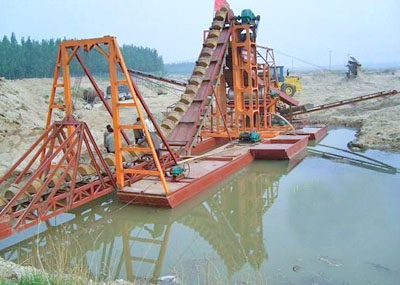 挖沙设备是沙场,河道挖沙的专业机械,也可以用作河道整改,其性能可靠, 维修方便,使用寿命长,耗资极少,工作量大每天500-5000立方米左右。挖出的沙子经筛选分离后沙质纯净,无杂质,是建筑水泥预制作业理想用沙。因此挖沙设备受到广大客户的一致好评。挖沙设备产品设有分离筛分系统,为单层、双层两种,沙中的石子、泥巴、杂草等都能与沙子分离,通过输送带将其送出。输送部分分为双输送式、单输送式及多传送几种。可将沙与杂质两边分离。输送沙子距离为10-20米,杂质输送距离为6-16米,并可根据客户要求回收石子.如果水面较宽可采用自卸式运输船配合作业.工艺流程:通过上四角轮配用减速机作为主动轮,下四角轮作为从动轮,挖沙斗用螺丝固定在链条上靠上四角轮驱动,挖沙斗把沙石混料挖到滚筒筛,滚筒筛对混料进行分离,符合标准的通过输送臂传到指定位置,不符合标准的石子等废料通过石子输送臂传到指定位置,或自溜入河道等。可以根据地理环境定做产品