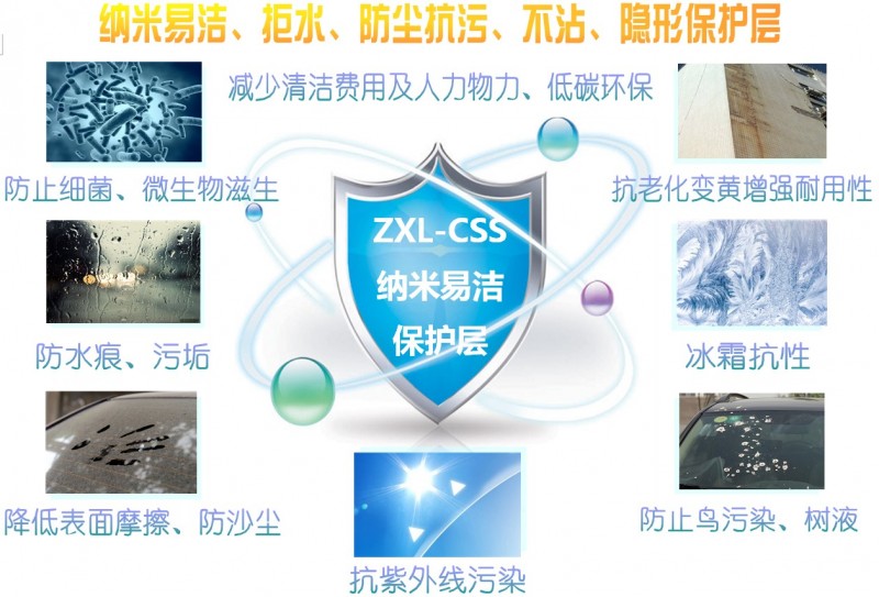 在玻璃、陶瓷表面会以化学键的形式非常牢固的结合,并形成一层固、液、气相结合的透明纳米保护膜,超疏水因为表面的拒水和荷叶效应以及超亲水会让水珠形成一个均匀的水膜,超亲水因为能起到增透玻璃的作用,被光伏电池板、玻璃幕墙广泛应用,且雨中自清洁,干燥无水痕,低碳环保,大大的降低了人工的清洁时间和人力物力,而被海内外客户形象的称其为液体玻璃、纳米涂层、纳米隐形保护膜。
