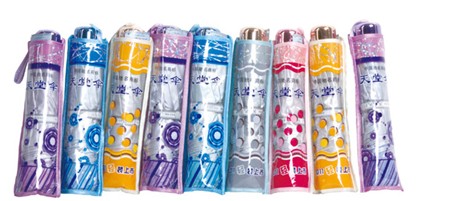 其他说明规格:57cm/8k三折超轻伞, 收起:长245mm*直径45mm 打开:伞面半径570mm 钢杆铝骨+PVC支骨 面料:高密聚酯银胶 成份:聚脂纤维100%产品执行标准:GB/T 23147-2008 防紫外线产品:UPF>40 T(UVA)AV<5﹪、防紫外线产品是指:本产品伞面经防紫外线工艺技术处理,具备防紫外线性能。使用说明:先拉出主杆,撑开前,应抖松伞面、看一下有无沾连,然后伞面朝上轻轻的缓慢将伞撑开,撑时大拇指不要摁住凸出的摁件,否则伞撑不住,影响使用寿命。储存方法:使用后晾干保存。请用软毛刷蘸中性洗洁剂清洁伞面污渍 适用范围:大众
