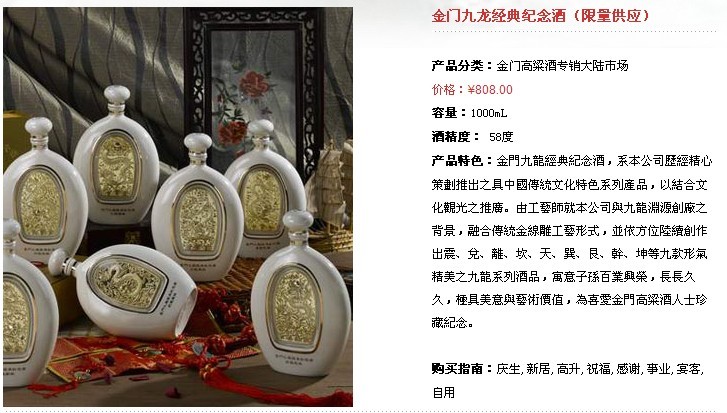 金门高粱酒是中国台湾地区的三大名酒之一,销量一直很大。其中白金龙酒、陈年高粱酒每年供应量都以100万瓶的速度上升。金门高粱酒香醇甘洌,风味独特,深受当地消费者喜爱。 金门属福建省泉州市所辖,由12个岛屿组成,因其特殊的历史和独特的地理位置,形成了这里特殊的酒类生产和消费市场。