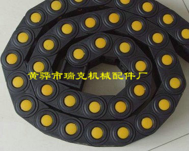 (3)单元链节由左右链板和上下盖板组成,拖链每节都能打开,装拆方便,不必穿线,打开盖板后即可把电缆、油管、气管、水管等放入拖链。