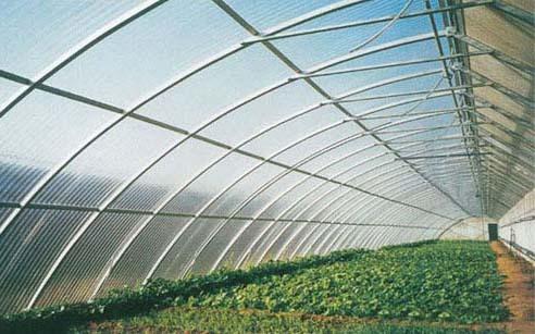 (3)防紫外线:PC板一面共挤有抗紫外线(UV)涂层,另一面具有抗冷凝处理,集抗紫外线、隔热防雾滴功能于一身。可阻挡紫外线穿过,及适合保护贵重艺术品及展品,使其不受紫外线破坏。 (4)重量轻:比重仅为玻璃的一半,节省运输、搬卸、安装以及支撑框架的成本。 (5)阻燃:国家标准GB50222—95确认,PC阳光板为难燃一级,即B1级。PC板自身燃点是580℃,离火后自熄,燃烧时不会产生有毒气体,不会助长火势的蔓延。 (6)可弯曲性:可依设计图在工地现场采用冷弯方式,安装成拱形,半圆形顶和窗。最小弯曲半径为采用板厚度的175倍,亦可热弯。 (7)隔音性:PC阳光板隔音效果明显,比同等厚度的玻璃和亚加力板有更佳的音响绝缘性,在厚度相同的条件下,PC阳光板的隔声量比玻璃提高5—9DB。在国际上是高速公路隔音屏障的首选材料。 (8)节能性:夏天保凉,冬天保温,PC阳光板有更低于普通玻璃和其它塑料的热导率(K值),隔热效果比同等玻璃高7%-25%,PC阳光板的隔热最高至49%。从而使热量损失大大降低,用于有暖设备的建筑,属环保材料。 (9)温度适应性:PC板在-40℃时不发生冷脆,在125℃时不软化,在恶劣的环境中其力学,机械性能等均无明显变化。 (10)耐候性:PC阳光板可以在-40℃至120℃范围保持各项物理指标的稳定性。人工气候老化试验4000小时,黄变度为2,透光率降低值仅0.6%。 (11)防结露:室外温度为0℃,室内温度为23℃,室内相对湿度低于80%时,材料的内表面不结露。露水会延着板材的表面流走,不会滴落。 (12)简易方便,不像传统材料那样笨重,在近几年广泛应用于我国沿海一带城市。阳光板用途 园林、游艺场所奇异装饰及休息场所的廊亭; 商业建筑的内外装饰、现代城市楼房的幕墙; 航空透明集装箱、摩托车前风挡、飞机、火车、轮船、汽车、汽艇、潜艇及玻璃军警盾牌; 电话亭、广告路牌、灯箱广告、展示展览的布置; 仪器、仪表、高低压开关柜面板及军事工业等; 壁、顶、屏风等高档室内装饰材料; 高速公路及城市高架路隔音屏障; 农业温室及养殖大棚; 温室大棚