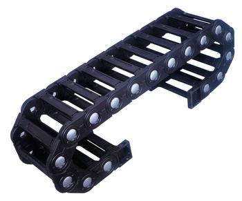 工程塑料拖链:外形美观,重量轻,长度可任意自行调整。拖链的用途和特点: 1、适合于使用在往复运动的场合,能够对内置的电缆、油管、气管、水管等起到牵引和保护作用。2、拖链每节都能打开,便于安装和维修。运动时噪音低、耐磨、可高速运动。3、拖链已被广泛应用于数控机床、电子设备、石材机械、玻璃机械、门窗机械、注塑机、机械手、起重运输设备、自动化仓库等。拖链的结构:1、拖链外形似坦克链,由众多单元链节组成,链节之间转动自如。2、相同系列的拖链内高、外高、节距相同,拖链内高、弯曲半径R可有不同的选择。3、单元链节由左右链板和上下盖板组成,拖链每节都能打开,装拆方便,不必穿线,打开盖板后即可把电缆、油管、气管等放入拖链内。4。另可提供分隔片,将链内空间按需要分隔开