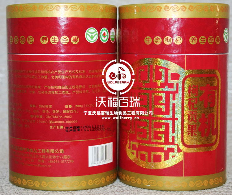 该产品的原料选自宁夏沃福百瑞有机枸杞基地的“枸杞贡果”,“贡果”在行业内级别是贡果级(每50克不得超过230个颗粒),国标中的级别是特优级(每50g不得超过280个颗粒的叫特优级),是最优质的宁夏枸杞,味道甜,果肉厚,果粒个头最大。