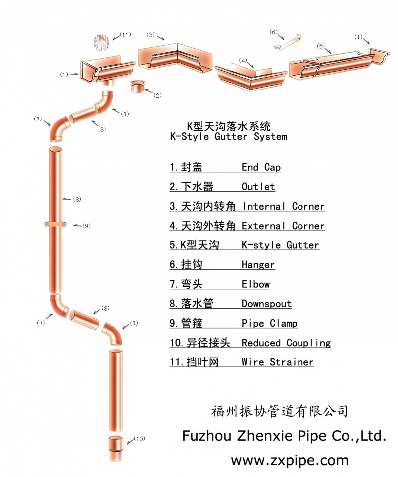 产品介绍振协6K型铜制落水是指檐沟上开口尺寸为6英寸(155mm)的K型双曲线外观的铜质檐沟,搭配3英寸圆型或2*3英寸方型铜质落水管的屋面雨落水排水系统。 产品属性1、材质:T2紫铜,电解韧铜或鳞脱氧铜,铜含量99。9%,符合欧洲标准;2、意大利进口先进的制造工艺成就了完美的造型设计;3、铜表面颜色自然渐变,直至高贵的暗绿色;4、终身免维护。铜落水系统是运用于高档别墅的特殊产品,其天然的氧化性能可以获得经典铜绿,使建筑看起来有旧建筑的感觉,增加整体的历史感。铜落水是近年城市历史文化建筑翻修和改造的首选。其他说明檐沟类型 横截面积 排水能力 搭配落水管6K型 0.014m2 3.5L/S 2*3英寸方管;3英寸圆管6.5H型 0.017m2 4.5L/S 3英寸圆管;4英寸圆管7K型 0.02m2 6.0L/S 3*4英寸方管;4英寸圆管交易说明款到发货、或者代收货款、预付30%定金后下单生产 了解更多、请联系公司电话、、我们将为您提供最优质的服务。。