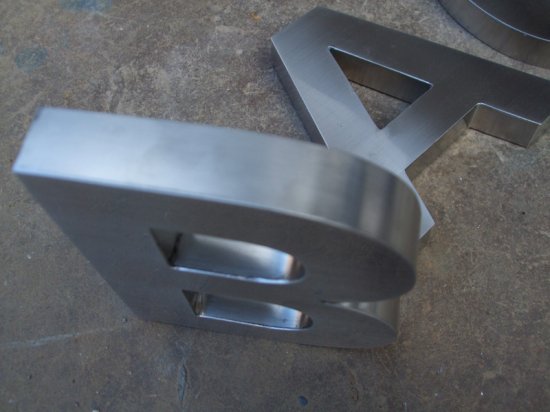 2.选用好的板材,这里选用304不锈钢板材,需要注意的是,一般面板的材料比围边材料要稍微厚点。准备就绪,就是激光雕刻板材。得到切割成型的不锈钢板后就是手工焊接。手工焊接的步骤是很重要的。只有经验丰富,技法娴熟的老师傅焊接出来的效果才能达到制作精工不锈钢字的要求。焊接处需要平滑均匀,无裂缝,无堆砌。焊接完成以后,不锈钢字的基本形状已经出来了,可以开始对边缝进行精心打磨。打磨到光滑平整,肉眼基本看不到接痕,最后就可以对其进行抛光处理。