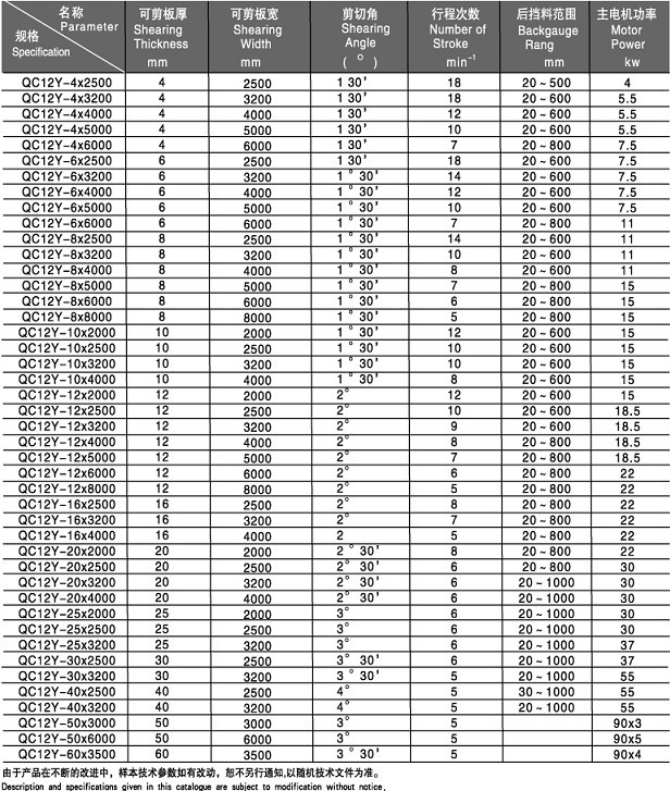 产品属性型号 可剪板厚(mm) 可剪板宽(mm) 剪切角 材料强度(N/mm) 后挡料调节范围(mm) 行程次数(次/分) 主电机功率(Kw) 重量(Kg) 外形尺寸 L×W×H(mm)