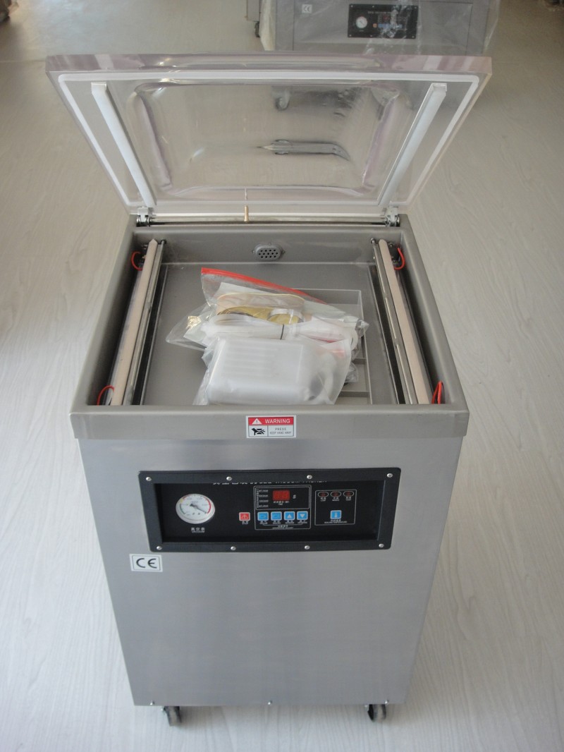 产品介绍 厦门真空机厂家 供应真空包装机定制及维修,厦门鑫四方包装机械(www.xsfbz.com)位于魅力鹭岛厦门,是一家从事经营热收缩机、封口机、有色印字打码机、真空包装机、捆扎打包机、封箱机、定量称重机、食品机械及包装设备的专业生产销售公司。 真空包装机械具有质量稳定、功能齐全、新颖美观,同时还有操作简单、维修方便、应用广泛等特点。非常适合于以复合薄膜或铝箔复合薄膜等软包装材料,对固体、液体、粉状、糊状、食品、果品、药品、化工产品、电子产品、精密仪器仪表、稀有贵金属等物品进行真空包装或真空后充入惰性气体包装。经真空包装后的产品可防止氧化、霉变、对食品类可保质、保鲜、延长其储存期限。对某些蓬松类物品,可有效地缩小外型体积,便于运输与储存。使用方法1、接通电源:根据需要拨动电源选择开关,即电源指示灯亮.电源选择开关指向真空为真空封口,指向真空充气为真空充气封口。 2、将装有物品的塑料袋置放真空室内.袋口整齐地摆在热封条上(如作充气包装至少应有一只喷咀插入袋口内)。 3、压下机盖,面板上抽气(真空)指示灯亮.真空泵开始抽气,机盖即被自动吸住,抽真空旋钮可根据包装要求调节真空度高低,调节时,视刻度由低至高,幅度要小。 4、当抽气达到设定的时间(即所要求的真空度)时,即抽气结束,抽气指示灯熄灭,充气指示灯亮,以示充气开始.充气旋钮可调节充气时间长短(即充气量多少),方法同上.如不需要充气.将电源开关拨到真空位置,程序自动进人真空包装,充气指示灯熄灭。 5、抽气或充气完毕时,指示灯随之熄灭,热封指示灯亮,即进入封口程序,面板上设有热封时间及温度调节旋钮,以适应不同厚薄材料,调节时间及温度时,旋动幅度要小,防止热封温度突然增高,烧坏热封配件。 6、当达到设定热封时间时,热封指示灯熄灭,以视热封结束,即真空室经电磁阀进入大气,直至机盖自动抬启,真空充气包装过程全部结束,准备进行下次包装循环。注意事项1.真空包装机应在温度-10℃—50℃,相对湿度不大于85%,周围空气中无腐蚀性气体,无粉尘、无爆炸性危险的环境中使用。2、为真空包装机确保真空泵正常工作,真空泵电机不允许反转。应经常检查油位,正常油位为油窗的1/2-3/4处不能超过,当真空泵中有水分或油颜色变黑时,此时应更换新油一般连续工作一两个月更换一次,用1#真空汽油或30#汽油、机油也可以。3、杂质过滤器应该经常拆洗一般1-2个月清洗一次,如包装碎片状物体应缩短清洗时间。4、连续工作2-3个月应打开后盖30对滑动部位及开关碰块加润滑油,对加热棒上的各连接活动处应视使用情况加油润滑。5、对减压、过滤、油雾三联件24要经常检查,确保油雾、油杯内有油缝纫机油,过滤杯内无水。6、加热条、硅胶条上要保持清洁,不得粘有异物,以免影响封口质量。7、加热棒上,加热片下的二层粘膏起绝缘作用,当有破损时应及时更换,以免短路。8、用户自备工作气源和充气气源,真空包装机工作压力已设定为0.3MPa,比较合适,无特殊情况不要调节过大。9、真空包装机在搬运过程中不允许倾斜放置和撞击,更不能放倒搬运。技术参数材料:不锈钢真空室真空尺寸:440x420x75mm电压:220V功率:0.75KW封口长度:400mm封口宽度:10mm 包装尺寸:55x64x60cm重量:75KG