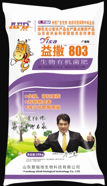 产品介绍山东爱福地 益撒803 有机生物肥益撒803是特定功能微生物(简单芽孢杆菌、类干酪乳杆菌、酿酒酵母等)和无害化处理的有机物料经复合而成的生物活性肥料;富含多种功能性微生物、精制有机质、激酶、活性肽、维生素、中微量元素和土壤调理剂PAM等。 产品属性主要成分 有效活菌数≥2.0亿/克,有机质(以干基计)≥30%,N、 P2O5、 K2O、微量元素(Zn、Cu、Fe、B、Mn),中量元素Ca、S、M g , 土壤调理剂PAM、激酶、生物活性肽适量。 适宜作物、用法用量及功效作 物 用法用量 功 效