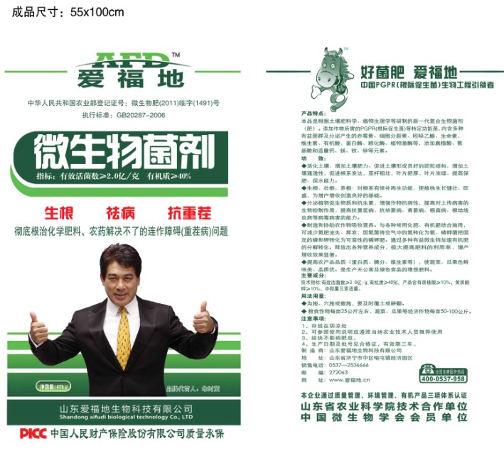 产品介绍山东爱福地 菌抗108 农用微生物菌剂主要成分:有效活菌数(简单芽苞杆菌、类干酪乳杆菌、酿酒酵母等)≥10亿/克,生物活性肽、激酶、精制有机质、核糖、核酸适量。产品属性功效特点:1. 提高作物产量,改善农产品质量。2. 诱导花芽分化,保花膨果,提高坐果率。3. 补充生物活性物质,使作物生长健壮,提高化肥利用率。4. 改善植物叶际微生物区系组成,诱导植物产生系统性抗性, 显著抑制病害发生;减少农药用量。5.促进细胞分裂,提高叶绿素含量,增强作物光合作用。6.减轻农业灾害,增强作物抗寒、抗旱、抗重茬、抗倒伏、抗干 热风、抗早衰、抗病害等抗逆能力。 用法用量:大田作物棉花、小麦、花生、玉米、水稻、油菜、大豆等使用倍数1000-1500倍叶面喷施蔬 菜