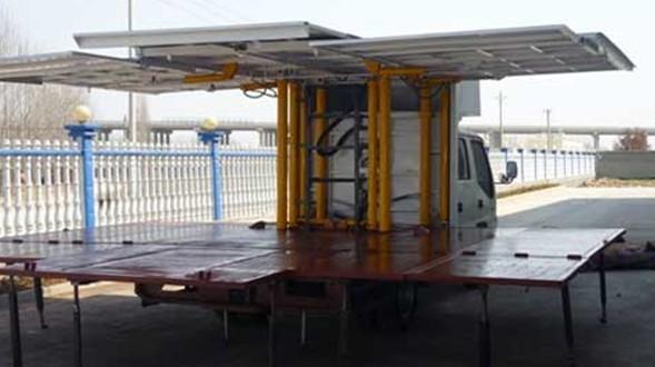 可根据用户要求选装导流罩,随底盘选装驾驶室前脸,车身前部灯具;车厢顶棚封闭,并采用衍架结构,可升降,车厢一侧板和后部侧板可展开,与顶棚形成整车舞台顶棚;活动舞台台板可折叠于车厢内,通过展开装置展开后与固定舞台台面形成整车舞台台面