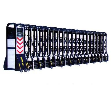 伸缩门(Retractable door),就是门体可以伸缩自由移动,来控制门洞大小、来控制行人或车辆的拦截和放行的一种门。伸缩门主要由门体、驱动电机,滑道、控制系统构成。门体采用优质不锈钢及铝合金专用型材制作,采用平行四边形原理铰接,伸缩灵活行程大。驱动器采用特种电机驱动,蜗杆蜗轮减速,并设有自动离合或手动离合器,自动离合停电时可自动启闭,手动离合停电时可手动启闭,控制系统有控制板,按钮开关,另可根据需求配备无线遥控装置。