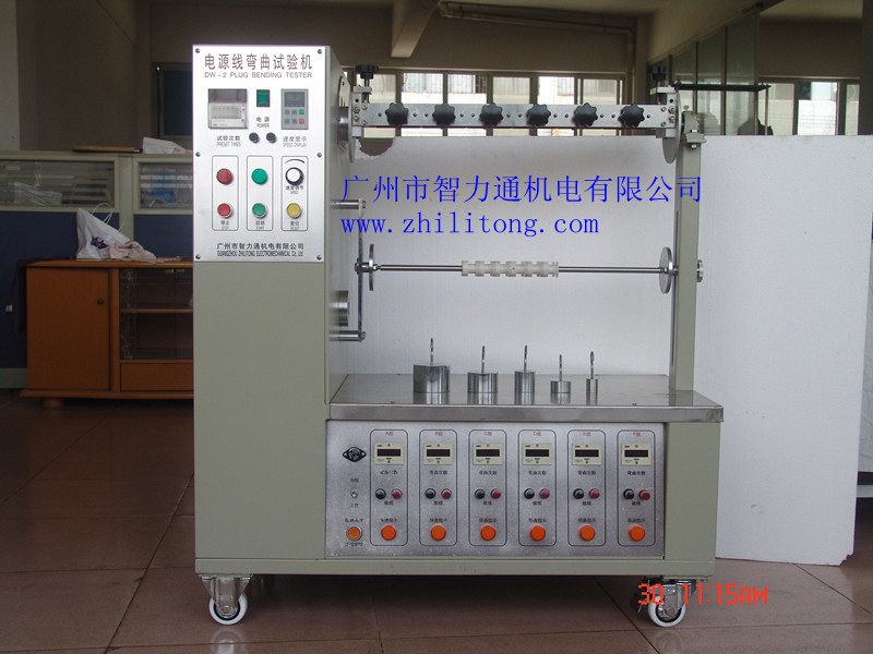 产品概述:本装置符合GB2099-2008图21、UL817、VDE0620、IEC884等标准要求,用于考核不可拆线电源插头(或端子)的耐弯曲性能,检验电源插头端子的牢固程度。将试样固定到弯曲机的摆动机构上,使摆动机构处于行程的中点时,软缆在进入试样处的轴线与水平线垂直并经过摆动轴,将软缆加上砝码作负载,然后使摆动机构摆动90度角(铅垂线两侧各45°),弯曲次数为10000次,弯曲速率为每分钟60次。