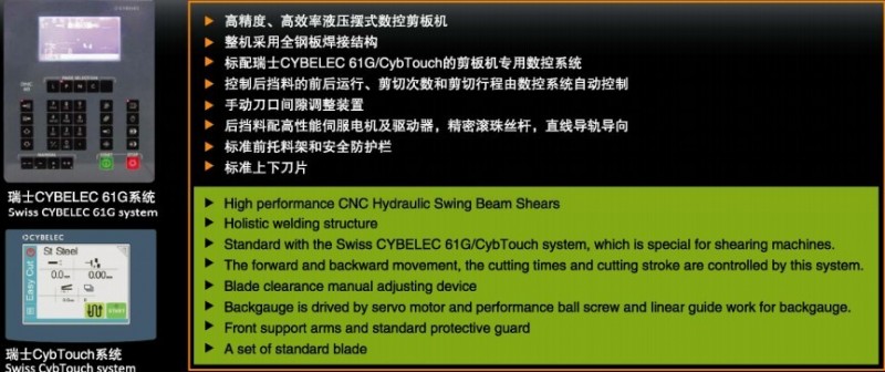 QC12K 系列液压摆式数控剪板机 高精度、高效率液压摆式数控剪板机 整机采用全钢板焊接结构 标配瑞士CYBELEC 61GCybTouch的剪板机专用数控系统 后挡料的前后运行、剪切次数和剪切行程由数控系统自动控制 手动