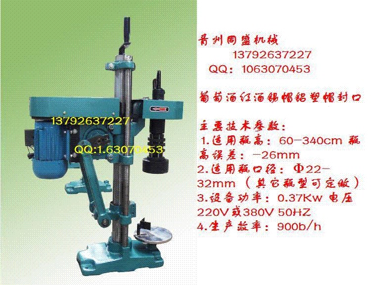 产品介绍DZ-1型单头压延机,采用了世界上最先进的日本封盖技术成果,适用于以代替热缩胶帽的铝质、铅质、锡质等金属盖进行滚延封口的液体包装工序,本机可单独使用,也可与我公司输瓶机连接后使用,组成液体包装生产线,是高档红酒、葡萄酒进行防盗防伪包装的理想包装机械。性能参数1.适用瓶高:60-340mm 瓶高误差:-26mm2.适用瓶口径:Φ22-32mm (其它瓶型可定做)3.设备功率:0.37Kw 电压220V或380V 50HZ4.生产效率:900b/h 5.整机质量:75Kg6.外形尺寸:600×8210×900mm其他说明用户订货时需提供瓶子样品和部分锡帽(铝帽),以供设计改制个别零件和试机使用,以更好的适应厂家使用,有其他特殊要求同时提出,不提则按照标准结构装机发货。购置配件需写清零件名称和数量。交易说明购买220V单项电源供电的机子,电源线一定要用2平方以上铜线,并且供电电源线不要太长,以免影响电机功率,造成启动困难。北方冬天在低于10℃的房间内使用,机子一定要先预热运行一段时间方可正常使用。