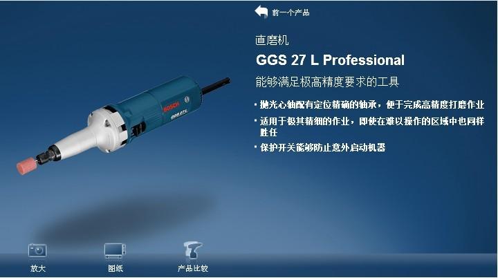 产品介绍产品参数:型号:GGS27L 品牌:博世 输入电压:220V 电磨功率:500W 空载转速:27000r/min 磨头直径:8mm 配件数:2x 磨石 适用范围:本机器(安装了金刚砂砂轮后) 适用于研磨金属及去除金属上之毛边产品属性主要特点长臂设计,打磨精细;排风口位置设计人性化技术参数工具头直径 8毫米最大磨轮直径 25毫米主轴环直径 35毫米输入功率 500瓦空载速率 27000转/分钟重量 1.6公斤适用范围本机器(安装了金刚砂砂轮后)适用于研磨金属及去除金属上之毛边。配备了电子调速装置之机型:在低转速之作业状态下,也可以在机器上安装刷子,扇状砂轮及磨削砂带。其他说明上海锐奔工贸有限公司(原上海祥马机电设备有限公司)是一家专业从事电动工具,建筑工具,焊接器材研发、生产、销售服务于一体的综合性运营企业。公司将始终遵循“以人为本,技术先导,品质卓越,服务真诚”的经营理念,愿与所有客户共同开创一个真诚、友好、融洽、合作的经营空间,我们将永远本着惠城于众,互利双赢的思想,与您真诚合作,共创未来。主要合作品牌:博世BOSCH 得伟DEWALT 麦太保metabo日立HITACHI 牧田makita ACC AEG虎啸工具 达龙 江苏东成DCA 优力特 鋭奇 锐奔 鸽牌 大象锋利 沪工工具 长城工具 沪工焊机 尤耐克焊机 优力特焊机 瑞凌焊机 锐龙焊机 宇宙焊机上海气动 岩田喷枪 公牛插座 莱塞激光 金镭激光 金桥焊材 起帆电缆等品牌品种多多,规格齐全在此不一一注明还望您的谅解!我们一站式专家团队愿为您服务,真情每一天!全国免费咨询热线:400-021-5986 在线QQ:399377532销售电话:021-66976648 021-56919388传真:021-56915812交易说明博世电动工具产品有质量问题凭保修卡售后说明,可在当地博世售后服务中心保修。(如果需要我公司代理保修运费自理),超过保修期后所产生的运费及其他费用由买家承担