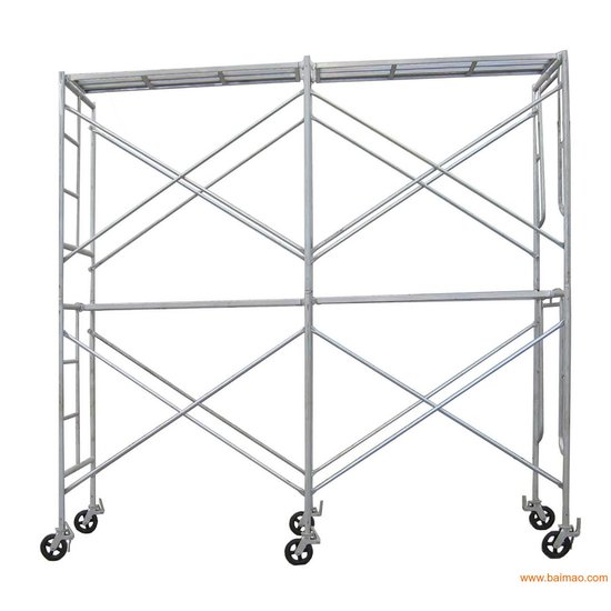 移动脚手架主要有主框,横框,交叉斜撑,脚手板,可调底座等组成。交叉拉杆又称斜拉杆、是纵向连接两副门架的交叉型拉杆。杆件两端压扁部分冲有销孔,组装时与门架立杆上的锁销锁牢。表面处理:电镀(冷镀锌)、 浸锌(热镀锌)脚轮:又称为地轮,可安装在移动脚手架下部,组成移动式脚手架.可作为机电安装.油漆粉刷.设备维修.广告制作的活动工作平台.脚轮为6寸带刹车,具有使用方便.移动灵活.安全可靠等特点.