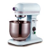 2.搅拌机(又称打蛋器):西点的常用投备,其用途广泛,既可用于蛋糕浆料的搅拌混合,又可用于点心及面包(小批量)面团调制,还可打发奶油膏和蛋白膏以及混合各种馅料。搅拌机一般带有圆底搅拌桶和三种不同形状的搅拌头(桨),网状用于低粘度物料如蛋液与糖的搅打,桨状(扁平花叶片)用于中粘度如油脂和糖的打发,以及点心面团的调制,勾状用于高粘度如面包面团的搅拌,搅拌速度可根据需要进行调控。此外台式小型搅拌器可用于搅打鲜奶油,馅料的混合及教学演习,既方便效果又好,更适合家庭使用。英国健伍、美国的厨宝是台式搅拌器世界名牌。
