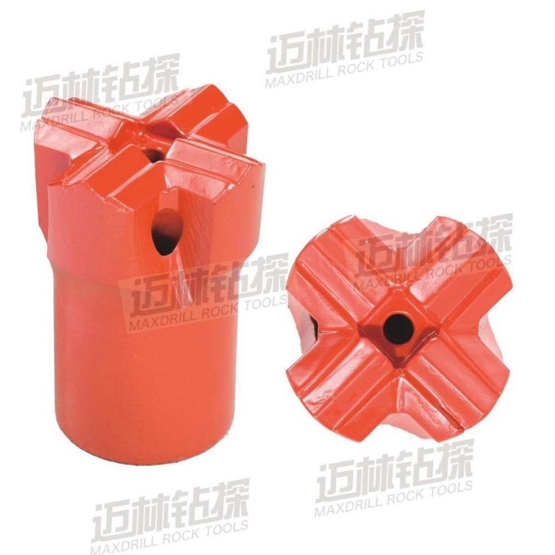 与锥度球齿钻头一样,十字钻头也有不同的锥度和尺寸,其合金片的形状为十字,是与岩石接触的主要作用面,在钎头磨损后,钎头可以再次打磨削尖继续使用。