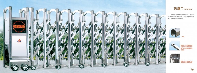 自动伸缩门,按“电动”分为普通型(需配功率控制箱,功率部分在控制箱里)机电一体化型(功率部分,及逻辑电路在电装本体上。此类电装性价比高,可靠性好),智能一体化型(只是在机电一体化上加了液晶显示,电子行程,电子力矩,遥控调试等功能),智能一体化只是对电装本体的更新,智能一体化的发展是总线型的智能一体化,及功率部件的更新,变频器的使用,及变频型。 电动伸缩门广泛适用于各类工矿厂房、车间、仓库、机房、车库等场合作为活动围墙,大大扩大了电动伸缩门的应用范围。