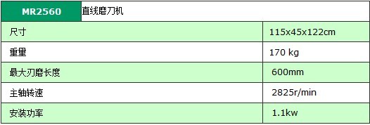 产品介绍MR2560 直线磨刀机 尺寸 115x45x122cm 重量 170 kg 最大刃磨长度 600mm 主轴转速 2825r/min 安装功率 1.1kw 性能参数直线磨刀机 产品型号: MR2560 西德木工机械成立于2006年,座落在有“中国古典工艺之都”美誉的福建仙游,是一家以木工机械销售贸易为主的民营企业。其他说明公司秉承“以质量保信誉,用服务求发展”的宗旨,始终以饱满的热情、真诚的合作态度,双赢的经营理念,广交天下客户朋友。...交易说明欢迎广大新老客户来电咨询所在地:福建 莆田市 仙游县(鲤城镇)经营地:仙游县鲤南镇一环西路红绿灯旁