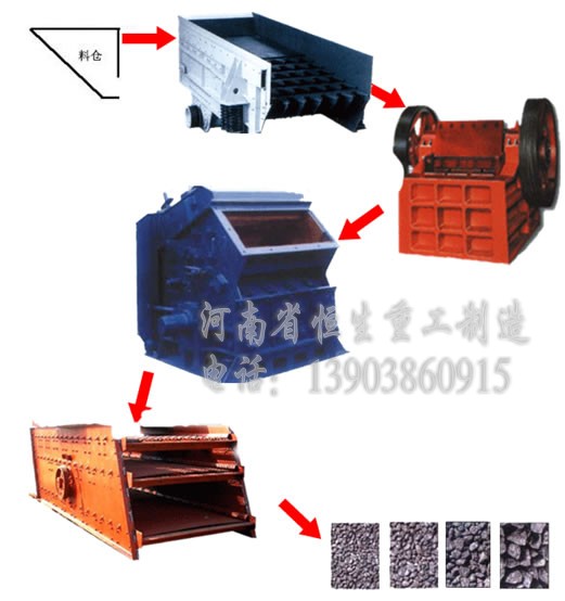 1、石子生产线中,破碎物料硬度不超过320Mpa,如花岗岩、玄武石等,皆适用二级破碎工艺,其主要设备有:振动给料机——颚式破碎机(一破)——石料破碎机(二破,可为反击式破碎机、锤式破碎机、冲击式破碎机)——振动筛——成品石子,中间以皮带输送机传送物料。