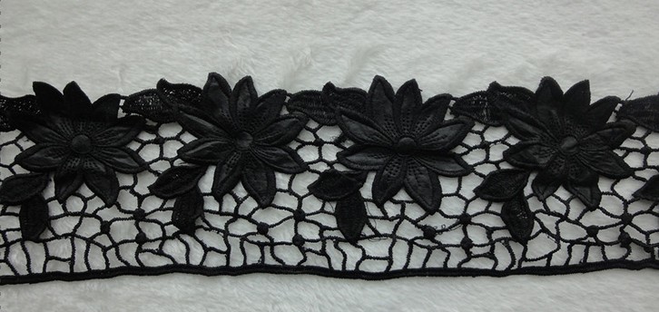 水溶花边是刺绣花边中的一大类,它以水溶性非织造布为底布,用粘胶长丝作绣花线,通过电脑平极刺绣机绣在底布上,再经热水处理使水溶性非织造底布溶化,留下有立体感的花边。[可定制,亦或来样来图加工]
