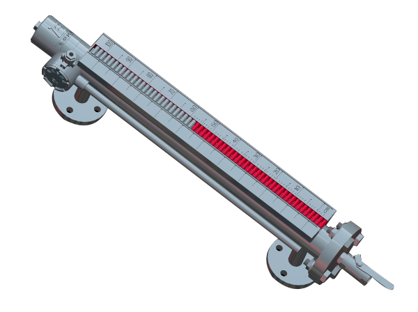 CCYB系列磁翻板液位计主体外的翻板箱受主体内浮子(具有定向磁性源,按不同介质和压力针对研制)的作用促其翻板翻动并显示红白颜色,并随浮子的移动指示不同的液面高度。在指示器左侧配有醒目的刻度标尺,从而使液位的指示显得更加清晰。