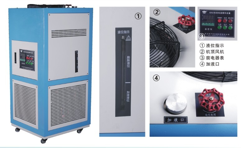 高低温系列循环装置整个系统的液体循环是密闭的,系统带有膨胀容器,膨胀容器和液体循环系统是绝热的,不参与液体循环,只是机械的连接,不管循环系统的温度如何,膨胀管容器中的介质始终保持室温。 由于整个液体循环是密闭的系统,所以低温时没有水汽的吸收,高温时没有油雾的产生。公司可以提供工作温度很广的导热油,所以同一台机器同一种导热介质可以实现-90—— -200摄氏度的控温。