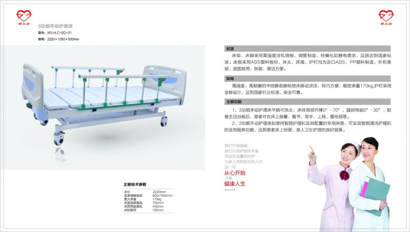 1、3功能搬运护理平躺可洗衣头;床体北部升降0°-70°,腿部下落20°-60°,配备生活台板后,患者可在床上,看书,写字,,看电视等。