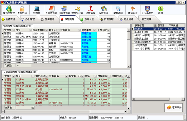 适合:物业、住宅、小区、公寓、写字楼、厂房、宿舍、商铺、专业市场等等租赁收费管理。管理人员可随时知道房屋的闲置情况、欠费情况、提前抄表结算报警、电脑自动打印各种单据、日报、月报、收支明细报表、实收收款、未收款、入住退房频率分析等。 1、系统提前7天通知哪些房间快要收费了,管房人及时做好收费打单准备。