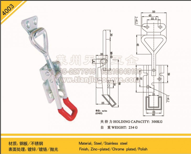 莱州天甲五金有限公司生产的电器工程搭扣,采用不锈钢材质制作,表面用过研磨振动抛光,产品有很好的防腐耐热性,广泛用于各种电器箱柜、阀门箱、户外公共箱、仪器供电箱、食品机械、工程管道阀门箱产品的连接固定,炼油厂阀门箱、LED路灯搭扣、石化海洋防腐保温工程、多晶硅保温工程、户外防水防爆灯具、电器箱柜、石化管道阀门箱、线槽盒、家具、环保风机设备、工具箱连接固定使用。