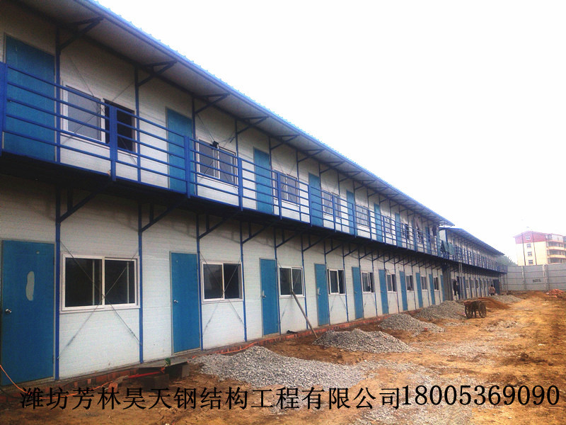 活动板房是一种以轻钢为骨架,以夹芯板为围护材料,以标准模数系列进行空间合,构件采用螺栓连接,全新概念的环保经济型活动板房屋。可方便快捷地进行组装和拆卸,实现了临时建筑的通用标准化,树立了环保节能、快捷高效的建筑理念,使临时房屋进入了一个系列化开发、集成化生产、配套化供应、可库存和可多次周转使用的定型产品领域。活动房种类中的彩钢板活动房的用料彩钢板是以彩色涂层钢板为面材,自熄型聚苯乙烯、聚氨脂、玻璃棉、岩棉为芯材,用热固化胶在连续成型机内加热加压复合而成的超轻建筑板材。具有以下特点: 1、规格多样化 2、安装灵活方便:彩钢复合板不仅大量减少建设物的基础工程和结构工程费用,且能多次拆装,施工安装灵活方便,综合效益十分显著。3、防火性好。4保温隔热、防腐隔音、轻质阻燃、抗震性能好、坚固美观、安装方便、有效增加房屋的使用面积以及无需二次装修。潍坊芳林昊天钢结构工程有限公司以严谨的施工组织,先进的制作安装工艺,过硬的施工队伍.可靠的信誉保障,在质量,价格,服务上占有绝对的竞争优势. 我公司有着一支较强的设计安装团队,可承揽各种异型房屋的设计,加工和安装-并开展租赁业务.可制作,安装各种规格,各种样式,各种颜色,固定式,迁移式活动房。