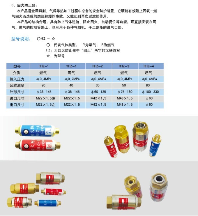 注意事项北京越华生产的回火防止器是金属切割、气焊等热加工过程中必备的安全防护装置,它既能有效阻止因氧-燃气回火而造成的燃烧和爆炸事故,又能起到再次过滤的作用。