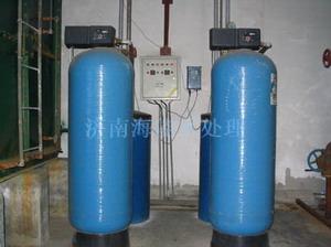 产品介绍一、概述软化水设备,顾名思义即降低水硬度的设备,主要去除水中的钙、镁离子,软化水设备在软化水的过程中,不能降低水中的总含盐量,可以用于空调等系统的补给水的软化以及生活用水的处理等。二、软化水设备的用途可广泛应用于蒸汽锅炉、热水锅炉、交换器、蒸发冷凝器、空调、直燃机等系统的补给水的软化。还可用于宾馆、饭店、写字楼、公寓、家居等生活用水的处理及食品、饮料、酿酒、洗衣、印染、化工、医药等行业的软化水处理三、工作原理由于水的硬度主要由钙、镁形成及表示,故一般采用阳离子交换树脂(软水器),将水中的Ca2+、Mg2+(形成水垢的主要成份)置换出来,随着树脂内Ca2+、Mg2+的增加,树脂去除Ca2+、Mg2+的效能逐渐降低。当树脂吸收一定量的钙镁离子之后,就必须进行再生,再生过程就是用盐箱中的食盐水冲洗树脂层,把树脂上的硬度离子再置换出来,随再生废液排出罐外,树脂就又恢复了软化交换功能。如以RNa代表钠型树脂,其交换过程如下:2RNa + Ca2+ = R2Ca + 2Na+2RNa + Mg2+ = R2Mg + 2Na+即水通过钠离子交换器后,水中的Ca2+、Mg2+被置换成Na+。一般控制阀的运行流程为:运行、反洗、吸盐、慢洗、盐箱补水、正洗。产品属性四、软化水设备工作流程及工作要求 1)软化水设备工作流程工作(有时叫做产水,下同)、反洗、吸盐(再生)、慢冲洗(置换)、快冲洗五个过程。不同软化水设备的所有工序非常接近,只是由于实际工艺的不同或控制的需要,可能会有一些附加的流程。任何以钠离子交换为基础的软化水设备都是在这五个流程的基础上发展来的(其中,全自动软化水设备会增加盐水重注过程)。反洗:工作一段时间后的设备,会在树脂上部拦截很多由原水带来的污物,把这些污物除去后,离子交换树脂才能完全曝露出来,再生的效果才能得到保证。反洗过程就是水从树脂的底部洗入,从顶部流出,这样可以把顶部拦截下来的污物冲走。这个过程一般需要5-15分钟左右。吸盐(再生):即将盐水注入树脂罐体的过程,传统设备是采用盐泵将盐水注入,全自动的设备是采用专用的内置喷射器将盐水吸入(只要进水有一定的压力即可)。在实际工作过程中,盐水以较慢的速度流过树脂的再生效果比单纯用盐水浸泡树脂的效果好,所以软化水设备都是采用盐水慢速流过树脂的方法再生,这个过程一般需要30分钟左右,实际时间受用盐量的影响。慢冲洗(置换):在用盐水流过树脂以后,用原水以同样的流速慢慢将树脂中的盐全部冲洗干净的过程叫慢冲洗,由于这个冲洗过程中仍有大量的功能基团上的钙镁离子被钠离子交换,根据实际经验,这个过程是再生的主要过程,所以很多人将这个过程称作置换。这个过程一般与吸盐的时间相同,即30分钟左右。快冲洗:为了将残留的盐彻底冲洗干净,要采用与实际工作接近的流速,用原水对树脂进行冲洗,这个过程的最后出水应为达标的软水。一般情况下,快冲洗过程为5-15分钟。2)软化水设备技术指标及工作要求入口水压:0.18-0.6Mpa 工作温度:1-55℃ 源水硬度: