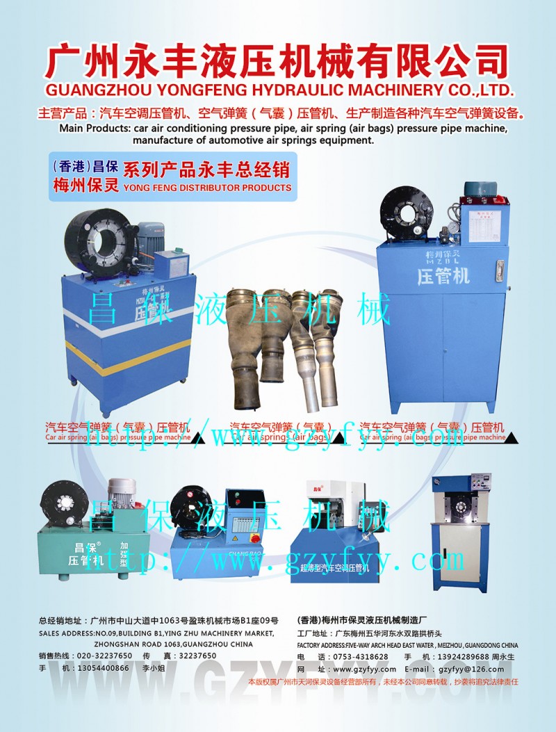 广州永丰液压机械生产油管扣压机、胶管扣压机、钢丝绳扣压机、建筑配件扣压机、液压扣压机、液压油管扣压机、高压油管扣压机、液压胶管扣压机、高压胶管扣压机、钢管扣压机、高压胶管接头扣压机、高压油管接头扣压机、工程机械油管扣压机、工程机械胶管扣压机、工程机械液压缩管机、工程机械液压油管缩管机、工程机械液压胶管缩管机、煤矿液压支柱专用扣压机、采煤机专用扣压机、煤矿专用扣压机、油田专用扣压机、吊车专用扣压机、挖掘机专用扣压机及各种扣压机的零部件。批发进口以及合资金高压油管 油咀接头等,批发进口发动机件!!!详情:http://www.gzyfyy.com