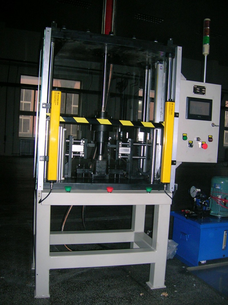 可根据距离,压力的特性对工件进行压装。可以实现压装数据的统计等功能。 1、机身采用四柱式结构,结构简单紧凑。 2、外敷透明亚克力板,便于观察。 3、电气系统采用触屏+PLC控制。 4、同时设有双按钮控制、声光报警、光幕保护等。 5、设有压力传感器、位移检测器可精确显示压力及位置。