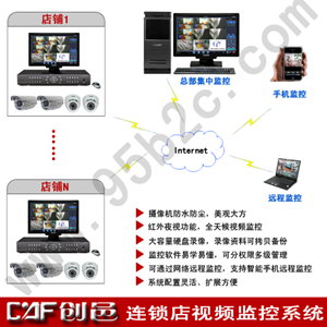 连锁店可以在各个分店安装闭路监控摄像头,监控图像通过网络传输到总部监控中心,管理者只要通过管理电脑就可以随时随地的监控各个分店的情况,节省时间和精力,同时可以更好做好管理和及时作出决策!