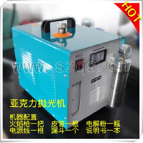 产品介绍采用电化学技术,通过特殊反应装置从水中提取氢氧气体的节能环保的设备,其中氢气燃烧,氧气用于助燃,可以取代乙炔、煤气、液化气等含碳气体,具有热值高、火焰集中、零污染,生产效率高,节能方便等优点。性能参数1,温度(800-3000dc)特别适合有机玻璃(压克力)广告水晶字或工艺雕刻制品的毛侧边、凹陷面、内孔、曲边等异型边角边侧的快速透明抛光,解决普通抛机无法做到的难题,环保经济。2,也适合金银首饰的熔化焊接,适合各种料厚度压克力毛侧边快速火焰抛光,高效简便。也适合携机到野外环境操作。 使用及维护维护保养1. 长时间不用时,应关闭电源,释放机内余气。2.连续时间1000个小时或是电解液变脏时,应更换电解液。用清水冲洗电解槽干净后再配置25%KOH电解液加入到电解槽中。3. 如在使用过程中,助剂罐中加有酒精等助剂,则应保持当日加,当日倒出的原则,以免酒精因电解槽热胀冷缩导致槽内负压而将酒精回流到电解槽中,导致电解液失效。检测电解液失效的方法是火焰为兰色而火焰无力。4.在打雷的天气 环境下,请勿使用,以免损坏电解电源。5. 出现机内气压高而火焰枪无气出来时,可能是阻火器或是火焰枪的阻火芯阻塞,可用温开水浸泡五分钟,然后甩干水份后重新接下使用即可。其他说明亚克力抛光——火焰抛光方法 这是一块切割下来的亚克力板的余料,可以看到上面有切割时留下的锯条的痕迹。或者是通过雕刻机切割下来的水晶字、标识标牌之类的亚克力板材。先用粗的砂纸(400号左右)再用细的砂纸进行精细打磨(800号以上的,有1200号的更好)。打磨完后,对抛光面进行清理,再用纯净的不含碳火焰抛光,如火焰抛光机、氢氧抛光机等。最后经过火焰抛光机抛光后的部分和不抛光部分的效果交易说明价格面议,欢迎咨询!