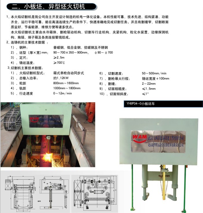 产品介绍北京越华厂家供应小板坯、异型坯火焰切割机;本火焰切割机是我公司自主开发设计制造的机电一体化设备。本机性能可靠、技术先进、结构紧凑、功能齐全、运行平稳可靠,能在高温连铸生产的条件下,快速准确地完成切割任务。并且有割缝窄、切割断面质量好、节省能源、维修方便等诸多优点。性能参数连铸机的主要技术参数:切割钢种:普通钢、低合金钢、优碳钢及不锈钢坯型(厚*宽)mm:90~700*350~900mm, Φ90~Φ700定尺:≥2.5m铸坯温度:≥700°C切割机的主要技术数据:火焰切割机形式:箱式单枪自动同步式总输入频率:约1.12kw轮距:800 mm~1600 mm轨距:1000 mm~1800 mm行走速度:割缝宽度:≤8mm行走速度:0~12 m/min切割速度:50~500 mm /min割枪最大行程:铸坯宽度+100mm割缝:2~22mm切面粗糙度:≤1.5mm断面倾斜度:≤1°使用及维护本火焰切割机主要由水冷箱体、割枪驱动机构、切割车行走机构、夹紧机构、粒化水装置、边缘探测机构、拖链、端子箱及各类连接管线组成。注意事项本火焰切割机是我公司自主开发设计制造的机电一体化设备。本机性能可靠、技术先进、结构紧凑、功能齐全、运行平稳可靠,能在高温连铸生产的条件下,快速准确地完成切割任务。并且有割缝窄、切割断面质量好、节省能源、维修方便等诸多优点。交易说明北京越华厂家供应小板坯、异型坯火焰切割机;本机性能可靠、技术先进、结构紧凑、功能齐全、运行平稳可靠,能在高温连铸生产的条件下,快速准确地完成切割任务。