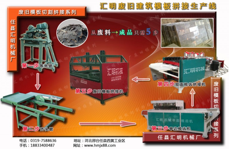 废旧模板翻新设备主要用于建筑工地使用的废旧模板、废旧多层板的再生利用,可以将小模板拼接成大模板,大大提高了建筑模板的利用率,并且改善了原板材的物理性能和使用质量;减轻了工人的劳动强度,提高了生产效率。