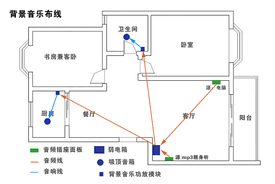 背景音乐一般采用的是单声道听音系统,立体声系统的听音范围比较小,只在两个音箱中间的位置才能感受到立体声效果,由于背景音响一般都是在做着其他什么事的时候为了营造氛围调节心情听的,不大可能坐在一个地方不动,再加上要做立体声设计的话对一般家庭来说太复杂,需要专门测试音箱的安装位置以满足立体声要求,所以背景音响都只做单声道设计。用于背景音响控制的音量开关就是86型的面板,看上去就跟电扇的调速开关差不多。音响的喇叭是并联的,布线的实际做法跟电灯的拉线方式一样的。背景音响专用的功放是定压式的,为了达到较长距离的功率传输,其输出端有输出变压器(在吸顶音箱内)提升电压以达到高电压小电流的输出。