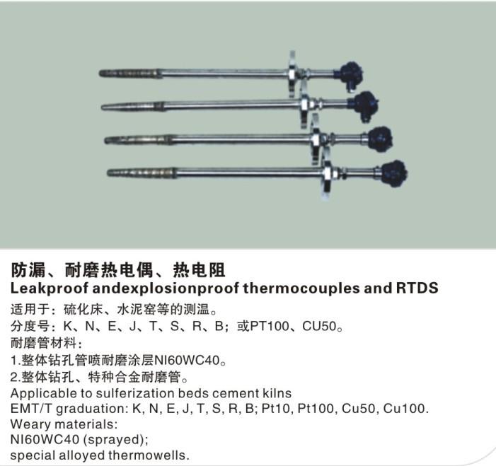 【厂家推荐】防漏耐磨热电偶、防漏耐磨热电阻价格信息WR系列耐磨热电偶采用等离子喷漆技术、高铬铸铁和高温合金不同材料制成的耐磨保护管,专门为高、中、低温耐磨环境的测量场合设计制造的,可适用于循环流化床、沸腾炉、水泥回转窑尾烟室、由于针对不同温度范围及被测介质而采用不同的高强度耐磨保护管及表面改性措施,构成复合管型实体化结构本系列产品适用于对保护管磨损严重的石油化工,输煤系统,流化床式锅炉,水泥熟料及耐火材料等流动粉体及物料的温度测量。进一步提高热电偶的使用寿命。其性能优于现行耐磨热电偶,博得用户好评。拥有多项高科技的产品处于国际领先水平,其特殊工艺的耐磨材料在不影响测温滞后的前提下,彻底解决了循环流化床锅炉测温热电偶的使用寿命,保护套管具有耐磨,耐高温氧化,耐硫化、耐液态铁粉、石灰石等水泥料腐蚀,抗冲刷,耐振动诸多技术,使测温热电偶使用寿命一般一至两年