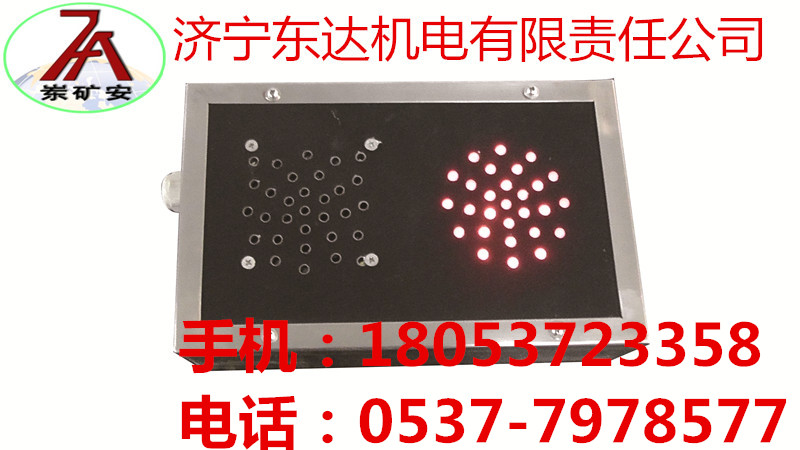 声光报警箱外壳上方有悬挂吊鼻,发光二极管为双色警示灯、双路输出,报警箱能发出红、绿两种颜色的光信号并伴有相应的警示语。